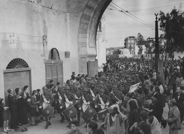 ![]() Basé à Constantine en Algérie, le 3e régiment de Zouaves fut d’abord envoyé dans le sud tunisien près de la frontière avec la Libye. Il fut ensuite transféré en France à la fin de l'année 1939. Il combattit contre les Allemands de Beauvais jusqu’aux environs d’Orléans où il fut écrasé le 25 juin 1940. Il parvint à sauver son drapeau. Le régiment fut recomplété en Algérie et devait participer aux campagnes de Tunisie en 1942-1943 puis de France et d’Allemagne (1944-1945). Provenance: NARA |