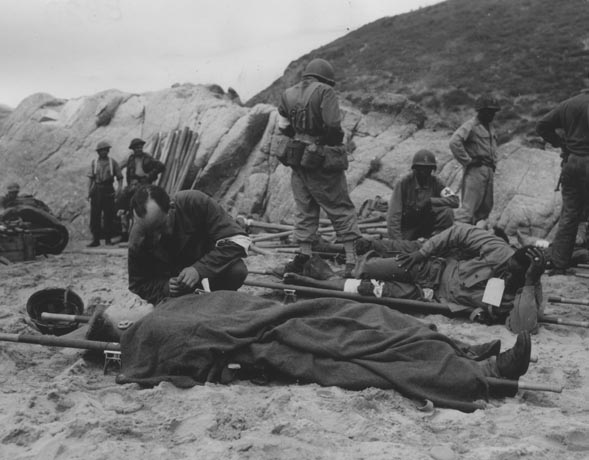 Soins aux blessés sur la plage de Marina di Campo, 17 juin 1944.