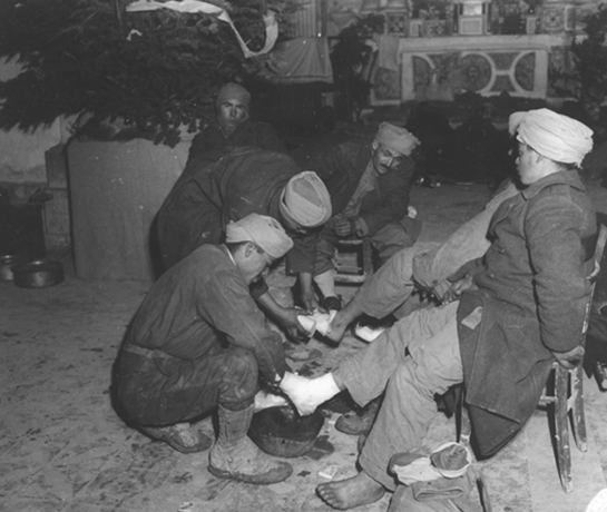 Des soldats du 8e régiment de tirailleurs soignant leurs engelures.