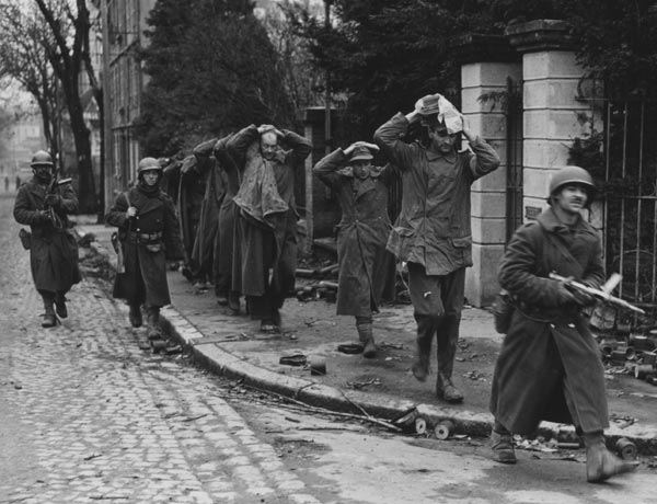 Des soldats d’un régiment de tirailleurs algériens escortant une colonne de prisonniers allemands.