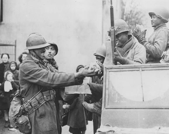 Tirailleurs algériens et G.I. américains sur le front en Alsace.